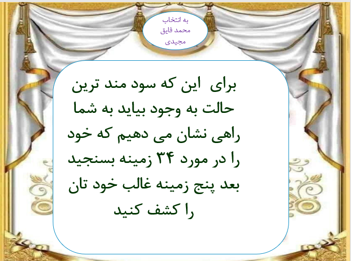 نوع فایل: Powerpoint (.pptx) (قابل ویرایش و آماده پرینت نکات کاربردی از کتاب کشف توانمندی ها شما نابغه ای اما به سبک خودتان 34 نوع هوش وتوانمندی انسان اگر کسی هر روز از کلاس اول ابتدایی به شما می گفت نابغه هستی اکنون شما چه سرنوشتی داشتی ؟ گر پدر و مادر شما می دانستند شما 34 نوع هوش دارید آیا شما سرنوشتی متفاوت نداشتی؟ شما کدام پنج نوع هوش را دارید و در آن خود را نابغه می دانید ؟ دکتردونالد او. کلیفتون (1924-2003) پدر روان شناسی توانمندی محور وایجاد کننده توانمندی یاب کلیفتون در وبگاه گالوپ است. توانمند ی یابی کلیفتون برآیند بیش از 50 سال کار حرفه ای دکتراست هدایت میلیون ها نفر در سراسر دنیا به کشف توانمندی هایشان در سال 2002 به دریافت نشان عالی پدر روان شناسی توانمندی محور از طرف انجمن روانشناسی آمریکا مفتخر شد. دو فرضیه کتاب : 1- توانایی هر فرد پایدار ویگانه است 2- بزرگ ترین فضای هر انسان برای پیشرفت در محدوده بیشترین توانمندی هایش است. تصور کنید اگر بتوانید با دومیلیون نفر در مورد توانمندی هایشان مصاحبه کنید چه چیزی ممکن است یاد بگیرید؟ تصور کنید با بهترین معلم های دنیا گفتگو کنید واز آنها بپرسید چطور بچه هار این قدر به چیزی علقه مند نگه داشته اند؟ وبعد تصورکنید همین کار را با بهترین پزشکان ، فروشندگان، وکلا، بازیکنان، هتل داران، مدیرا، مرشدان، مهندسان، و.... بپرسید طی 30 سال موسسه گالوپ این کار را انجام داده ودر نهایت کمی بیش از دومیلیون نفر مورد مصاحبه قرار گرفته اند و نتایج تجزیه وتحلیل شده است . در همه مشاغل تنوعی از دانش،مهارت، و استعداد کشف می شود در نهایت 34 زمینه متداول استعدا در انسان کشف شده است هرچند انسان فراتر از این 34 زمینه می باشد. 34 زمینه را مشابه 88 کلید پیانو در نظر بگیرید 88کلید نمی توانند هر نتی را که امکان نواخته شدن دارد ، بنوازد اما در ترکیب های بسیارشان می توانند هر موسیقی را بنوازند. 34 زمینه توانمندی انسان هم همین گونه است . برای این که سود مند ترین حالت به وجود بیاید به شما راهی نشان می دهیم که خود را در مورد 34 زمینه بسنجید بعد پنج زمینه غالب خود تان را کشف کنید کشف تونمندی ها به شما کمک می کند تا کشف کنید که چطور با استفاده از قدرتمند ترین استعداد های ذاتی تان موفق شوید فروش فایل با سایت لوکس فایل